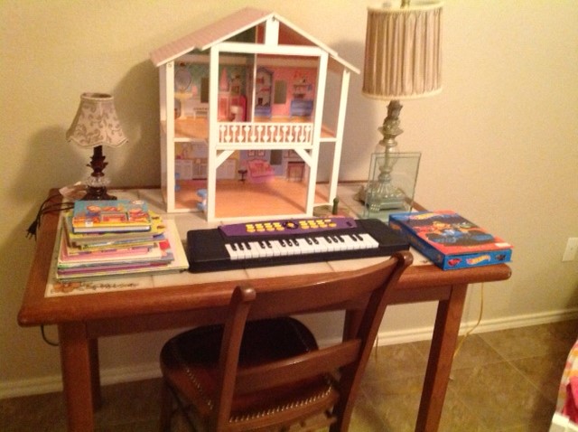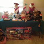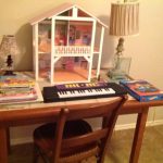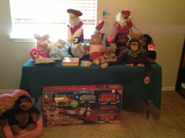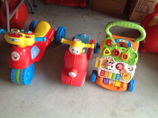Toys, baby swing, bassinet, stroller, toddler bed, stuffed animals, dolls.