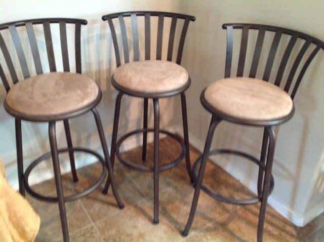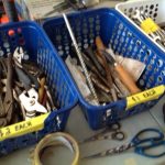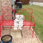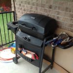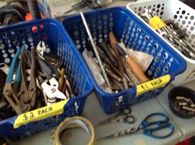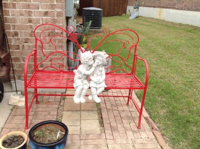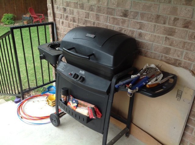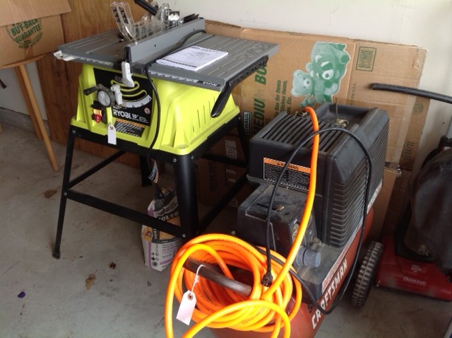 Hand tools, outdoor bench, plants, pots, Charbroil barbecue grill, outdoor chairs,