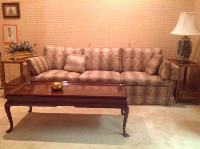8 ft living room sofa, 2 arm chairs, coffee table
